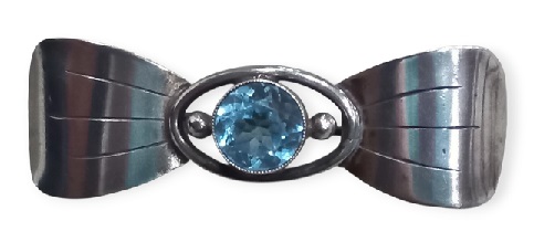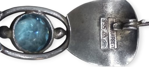 gemerkt : handenarbeid. zilvergehalte : 835. in zeer goede staat. met blauwe steen. 5 cm lang en 1,7 cm breed. verzending mogelijk