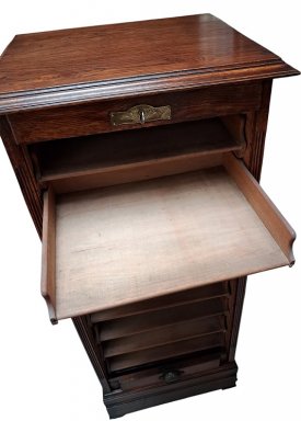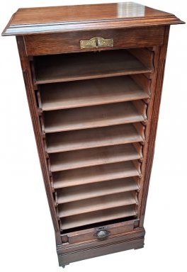 in massieve eik. in goede/originele staat. met werkend slot. alle archiefbakjes zijn aanwezig. 117,50 cm hoog. 50 cm breed en 44 cm diep. geen verzending, afhalen na afspraak te 3120 Tremelo