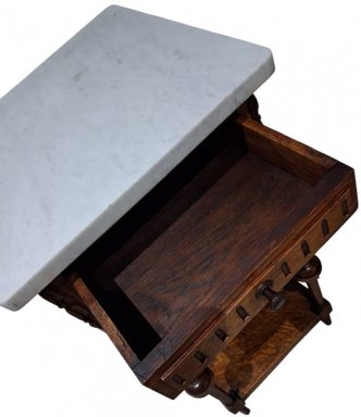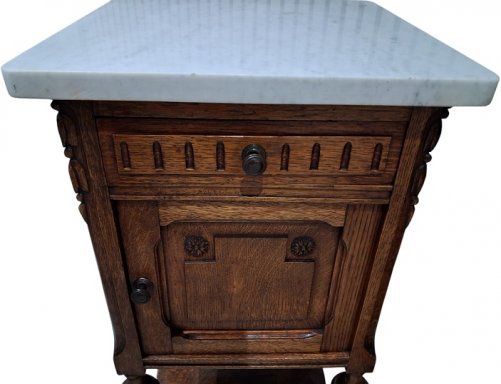 met 1 deurtje en 1 schuifje. in zeer goede staat. in massief eikenhout. met wit marmeren tablet. hoogte : 82 cm. breedte : 40 cm. diepte : 40 cm. geen verzending, afhalen na afspraak te 3120 Tremelo